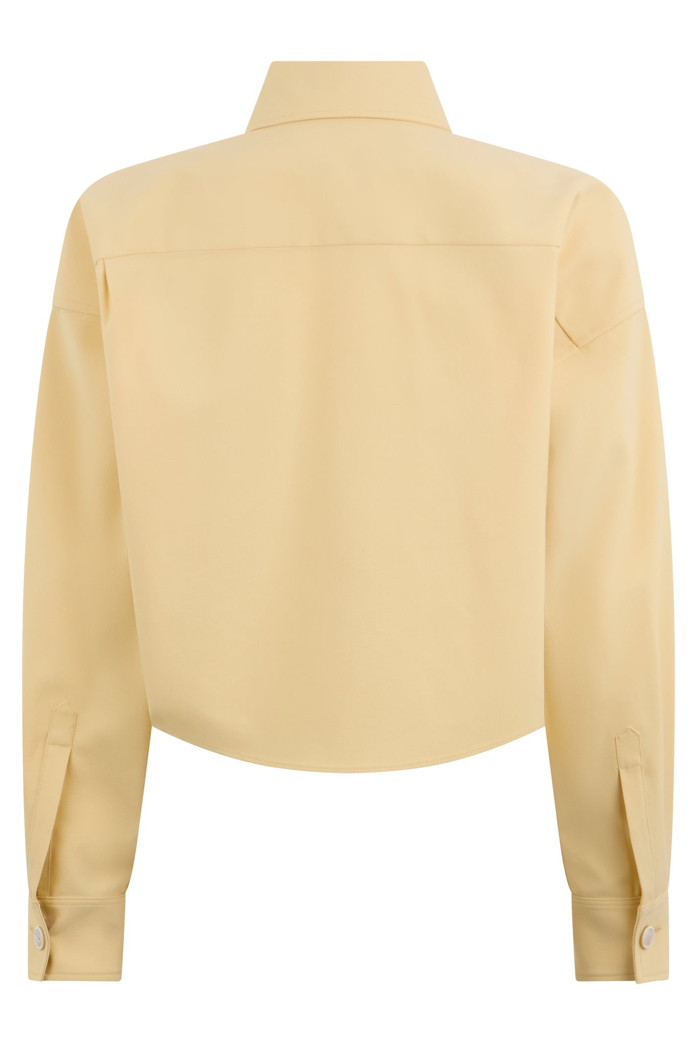 Cropped shirt with modern design, made in a soft light shade. Features a front closure with buttons and a classic collar, offering an elegant and versatile look. The long sleeves, slightly wide, add a touch of comfort and style. Ideal to pair with high pants or skirts for a trendy outfit. Perfect for seasonal transitions and suitable for various occasions.