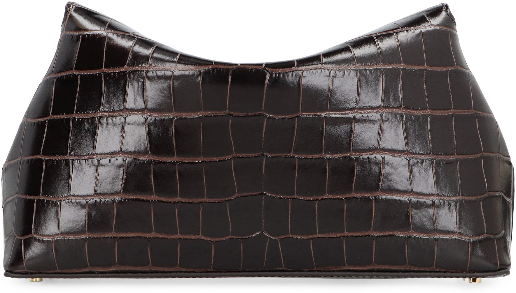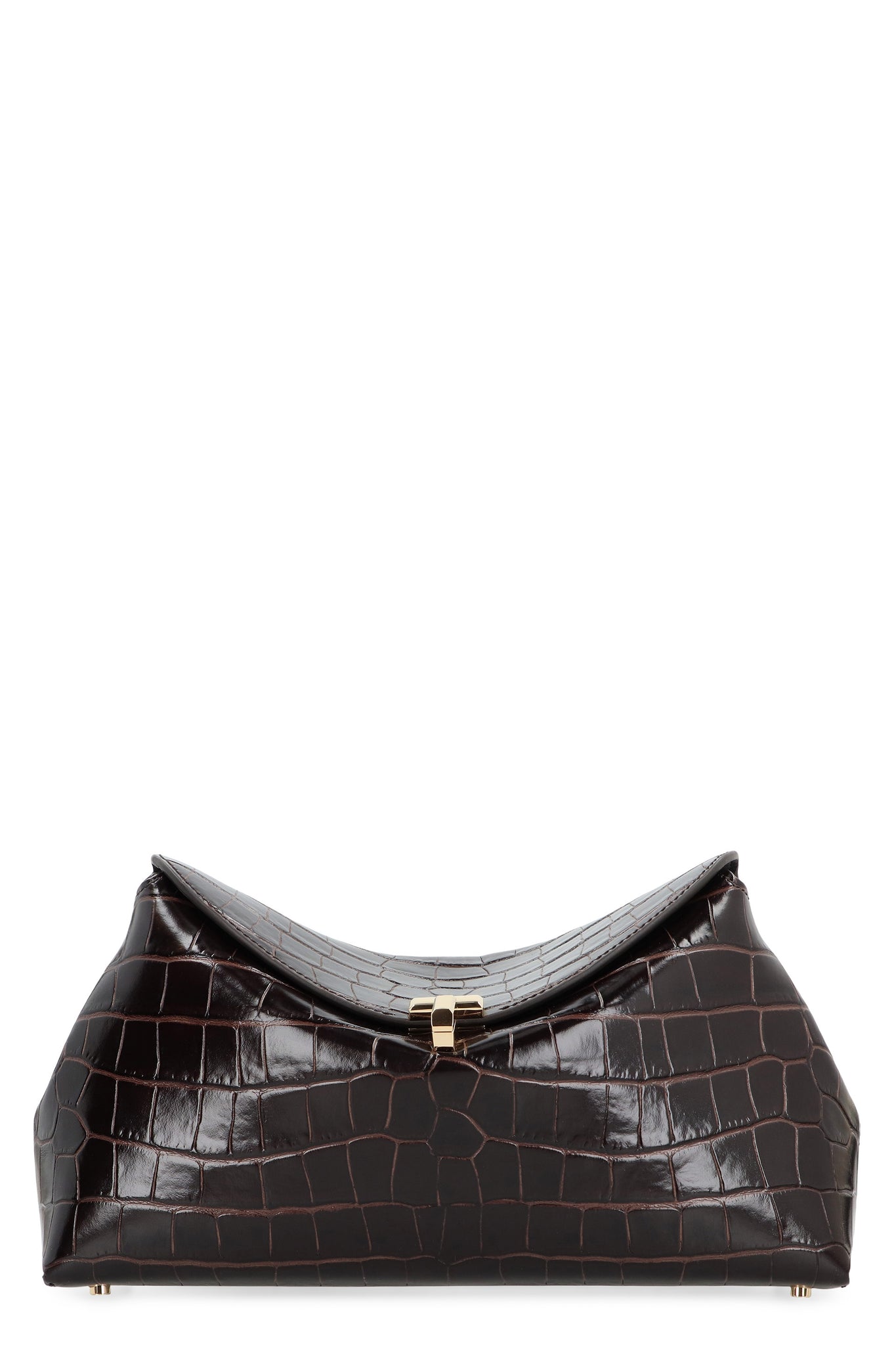 Handheld sculptural bag, called T-lock for the golden metal swivel closure that secures the curved upper flap. It is made of crocodile-effect leather and has an internal compartment for cards. You can carry it by hand or wear it crossbody thanks to the optional shoulder strap. Perfect to pair with different outfits, this bag is an essential accessory for anyone looking for style and functionality.